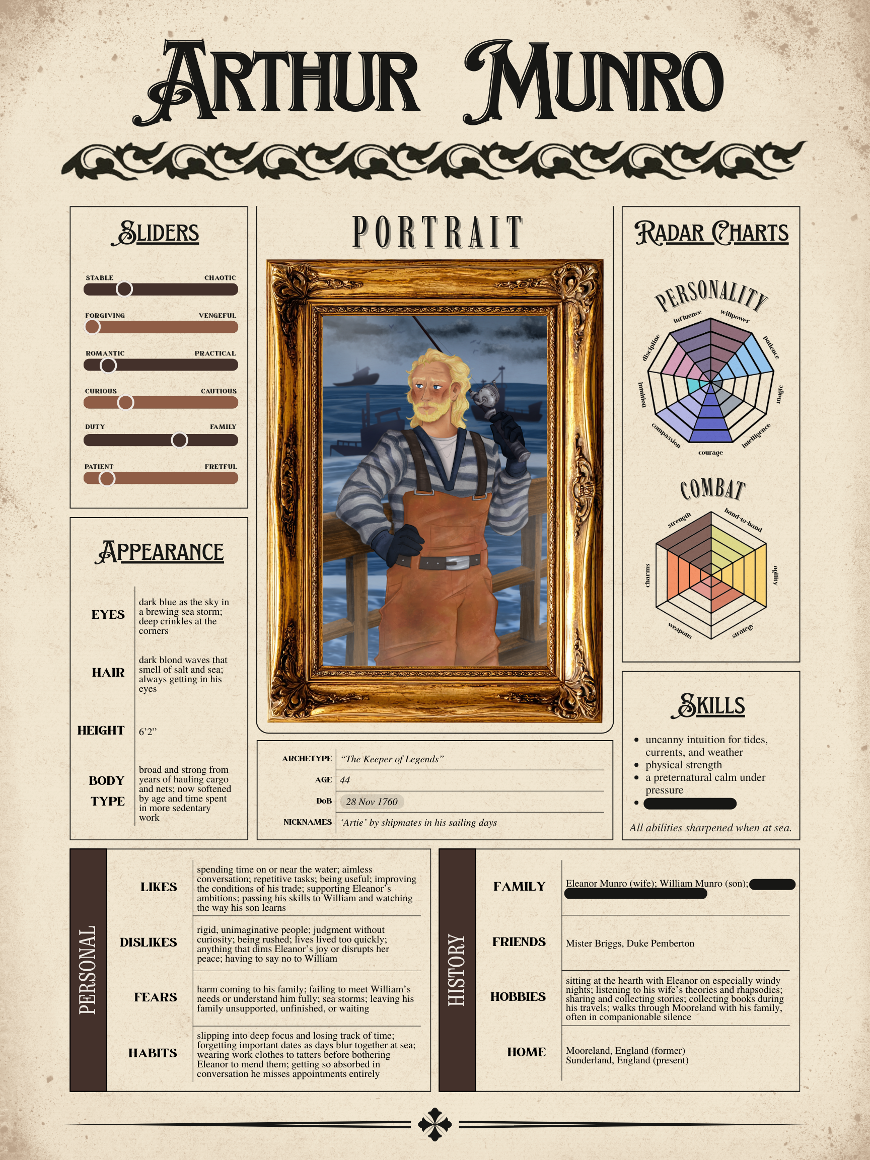 Long before he settled into life as Mooreland’s fisherman, Arthur traveled widely as a merchant sailor, gathering not only experience but stories. He is a natural storyteller, deeply impacted by the narratives he’s collected. Fiercely devoted to his family, Arthur’s life is guided by the desire to provide and protect. His love for Eleanor and William is his most valuable treasure. Shaped by years at sea, he moves through the world with fluidity and patience—emotionally perceptive, empathetic, and unafraid of feeling deeply. Arthur is calm, adaptable, and enduring, his outlook forever influenced by the vastness he has known.