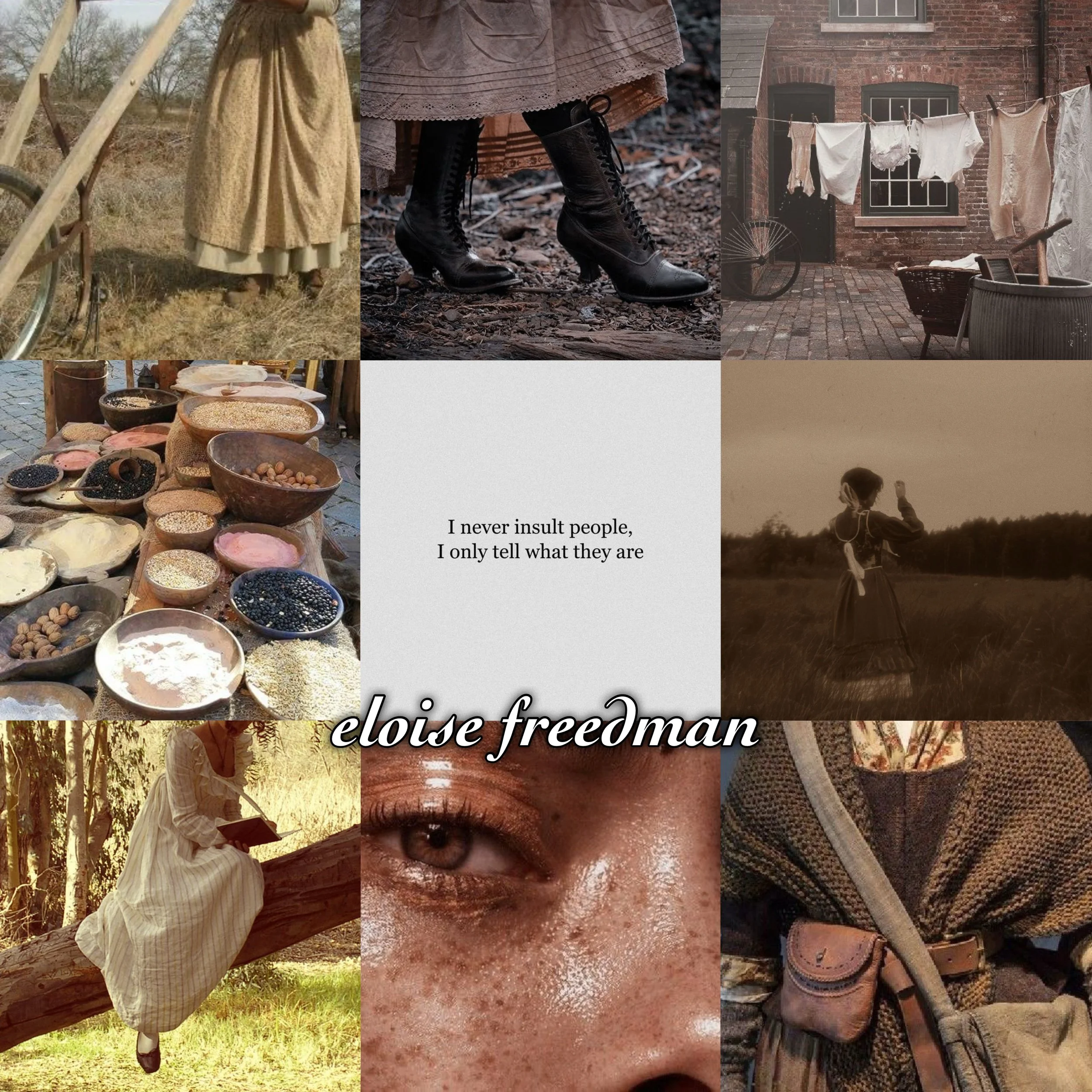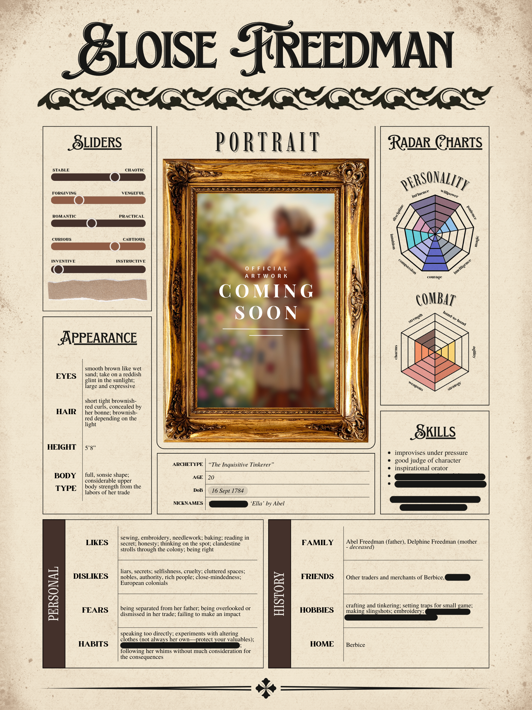 As the only child of a father whose body can no longer sustain his work, Eloise learned how to shoulder responsibility without complaint. She takes pride in her work and finds comfort in staying busy. While known for being blunt and short-tempered, she is just as quick to forgive as she is to judge, trusting of her instincts and whims. Eloise is insistent on learning to read and write despite the limitations of her station, carving out private moments to study, sew, bake, or read in quiet corners of the colony. She enjoys wandering alone, finding hidden places to think, content in her own company. Eloise embodies a humble life lived on her own terms.