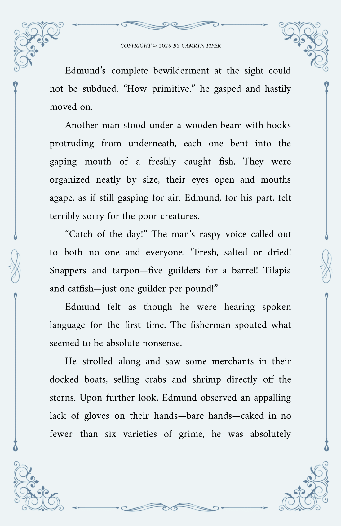 …Wherein, Lord Edmund volunteers to procure provisions for his crew and promptly discovers that he has no idea how markets work. Confronted with bartering, bare hands, and live poultry, he judges liberally while realizing—too late—that noble education has left him woefully unprepared for common commerce.